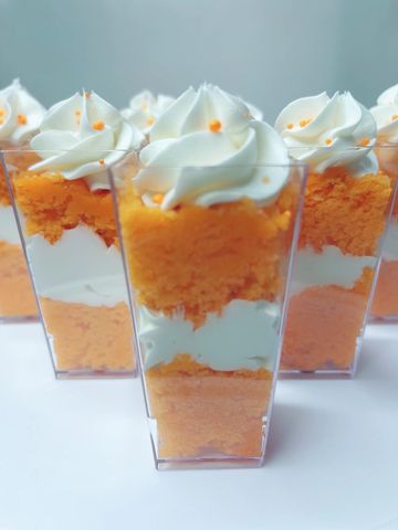 Single serving 3-ounce cake shooter layers of moist cake and buttercream. 1 flavor per dozen, additional toppings can be added for an additional fee.
