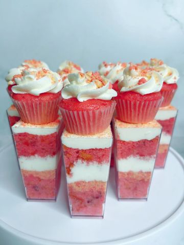 Single serving 3-ounce cake shooter loaded with a mini cupcake. 1 flavor per dozen, additional toppings can be added for an additional fee.